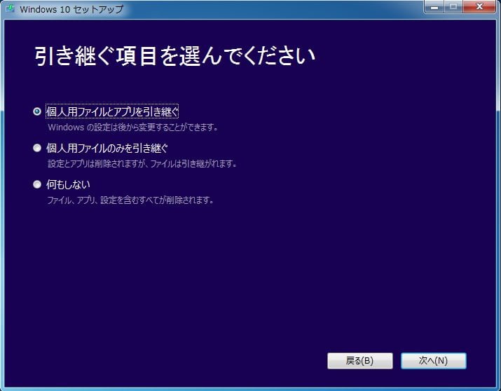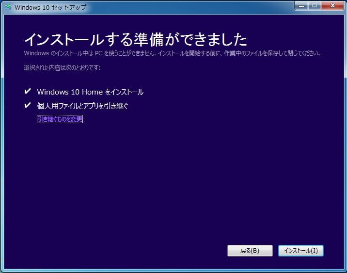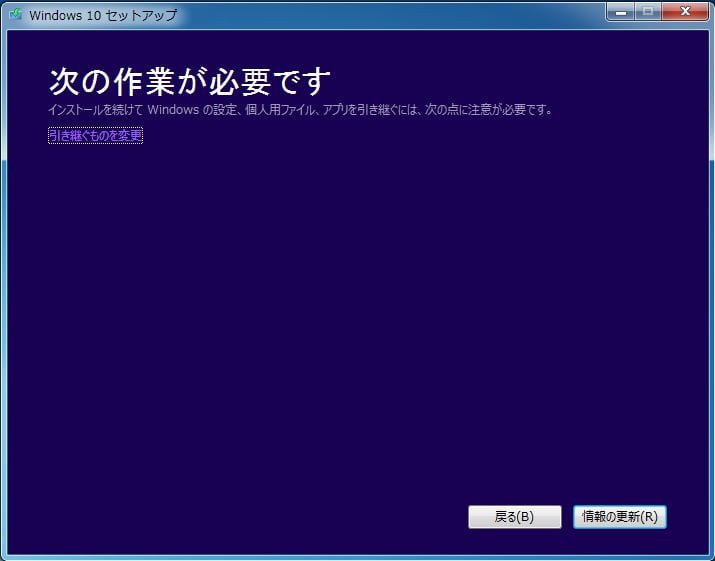 互換性の問題がなくなったら、ようやく個人用ファイルとアプリを引き継ぐアップグレードのインストールを開始できます。