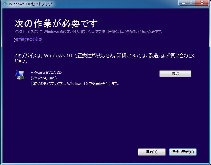 下の画像は、VMwareのテスト環境でVMware SVGA 3Dで問題が発生しますと出ていましたが、「確認」を押してアップグレードしても問題なくWindows10が動きました。(汎用ドライバーに置き換わりましたが。)
