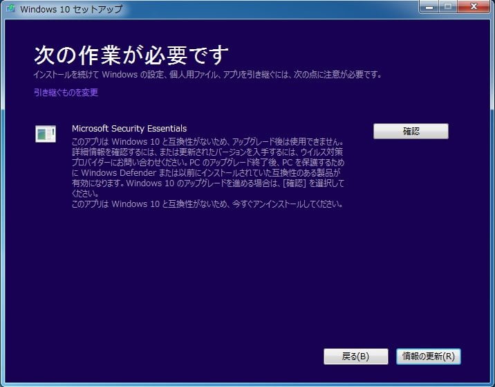 マイクロソフトのSecurity Essentialsは強制的に削除されますが、なぜか確認が必要の画面が出てきます。ここは「確認」をクリックしてから「情報の更新」をクリックします。