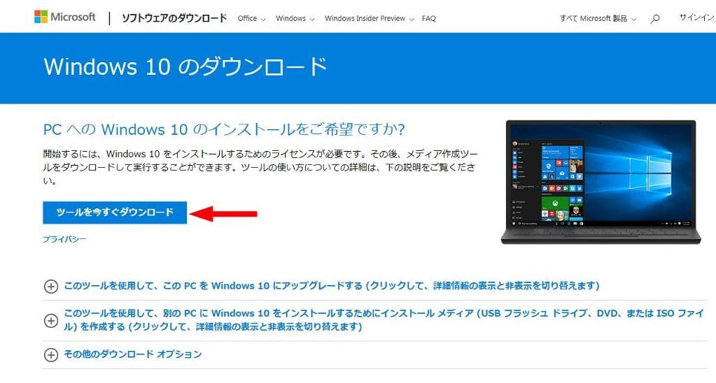 Windows7 SP1でアクセスした場合は、「ツールを今すぐダウンロード」のボタンしか表示されていないはずなのでそこからMediaCreationTool1809.exeをダウンロードして実行します。