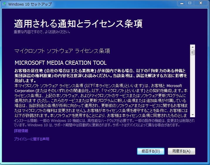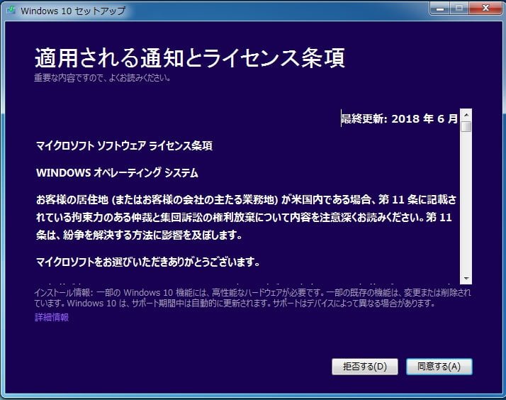 ここで数GBのインストールデータのダウンロードとメディアの作成が始まるので、ネット回線によりしばらく待ちます。準備ができたら、もう一度内容が更新されたライセンス条項に同意する画面が出てくるので「同意する」で次へ進みます。