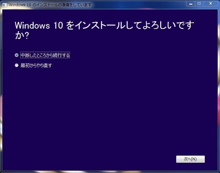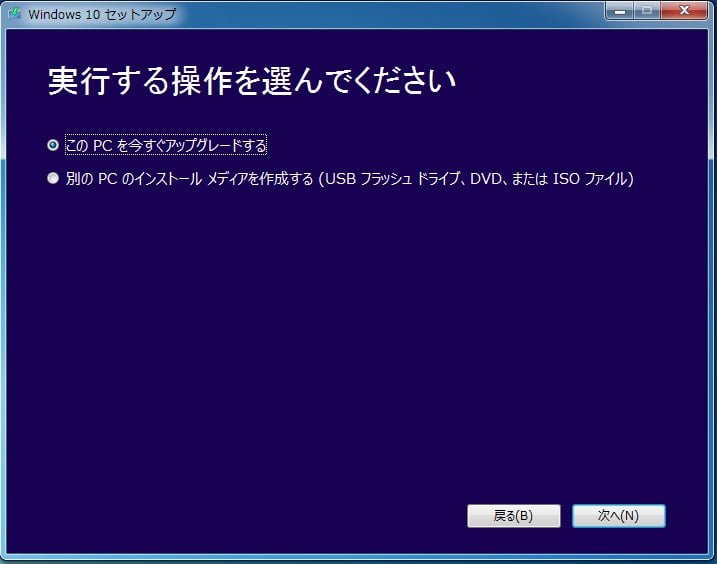 (2019/8/13追記)バージョン1903では、アップグレード途中で再起動が必要になったときに「中断したところから続行する」画面が出ないことが多いようです。そうなると 「このPCを今すぐアップグレードする」 のほうを選んでいると、またダウンロードから始まるので時間ばかりかかる可能性があります。先にインストールメディアを作成しておいたほうが作業が捗ります。