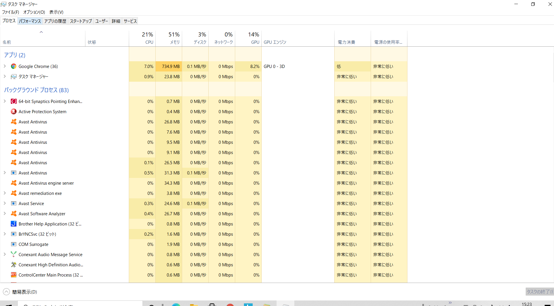怪しいアプリのプロセスは無さそうでしたが、Avast関連のプロセスがたくさん実行中でした。