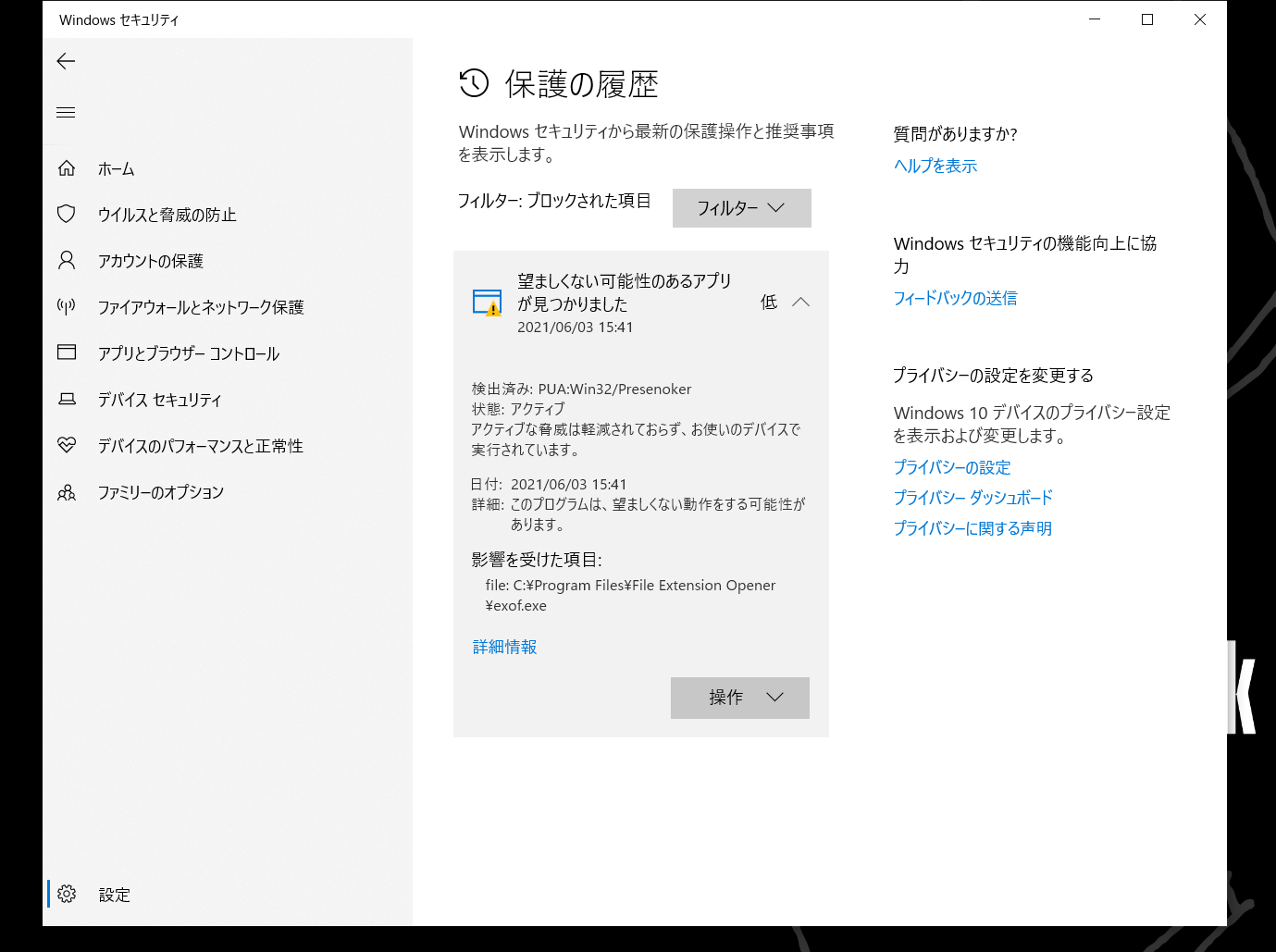 Avastをアンインストールした瞬間にWindows Defenderが有効になり、File Extension Openerに反応していました。(Malwarebytes Freeで実行プログラムは削除済み)