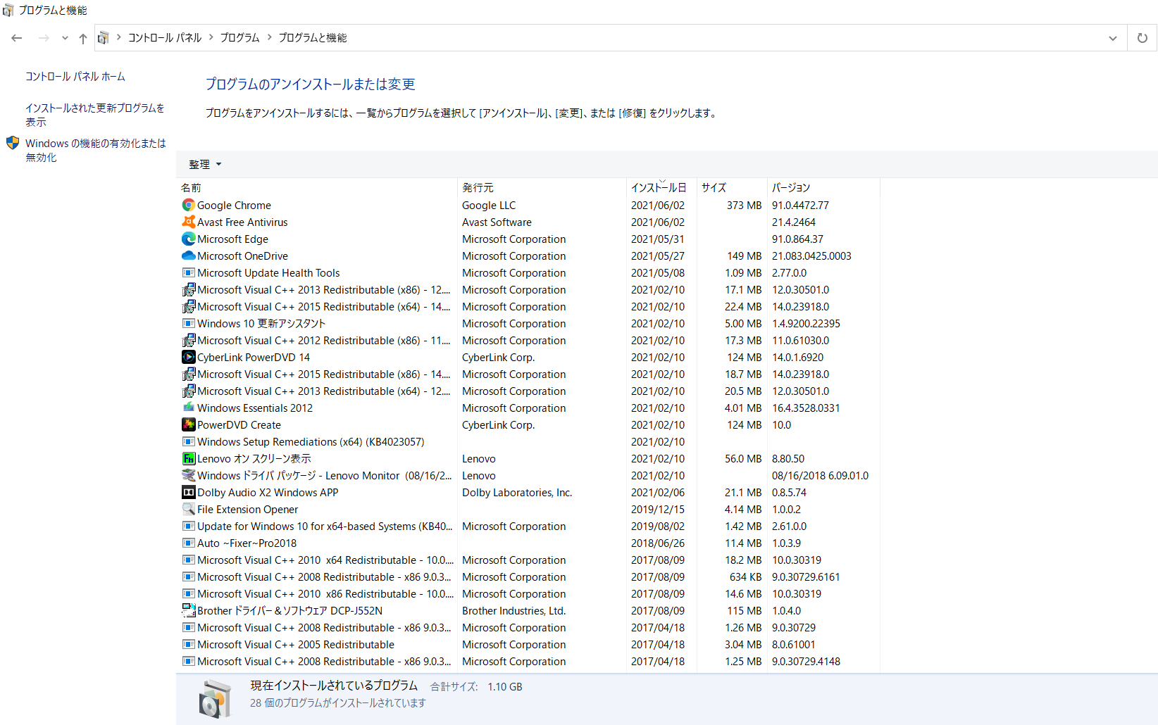 直近のインストール日を見るとAvast Free Antivirusがありますが、Avastは以前からインストールされていたということでした。これは最新バージョンにアップデートインストールされたということのようです。