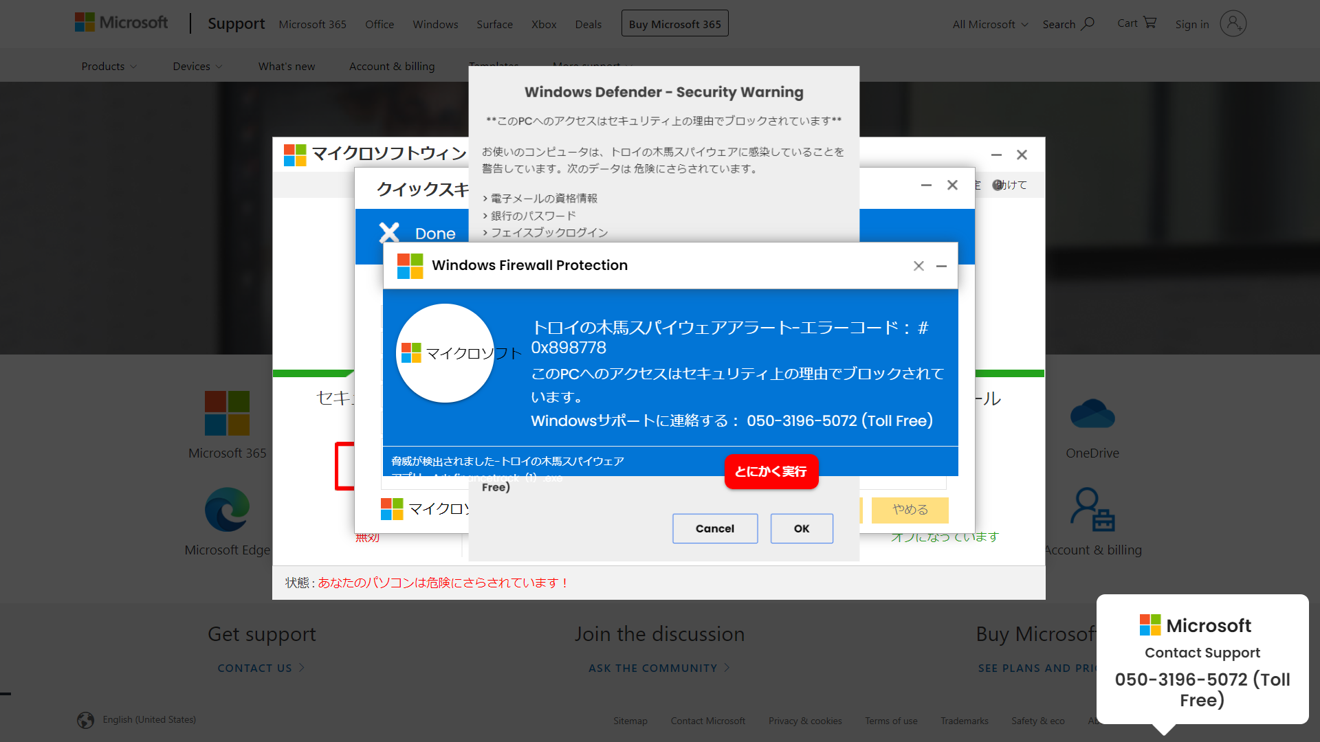 パソコンの画面いっぱいに表示される警告画面のようにみえます。バック一面にマイクロソフトのサイトを背景にして、Windowsのロゴマークを使い、Windows DefenderやWindows Firewall Protectionからの警告のように偽装しています。