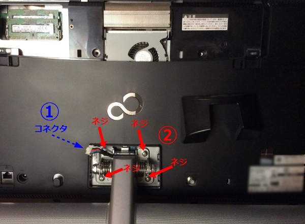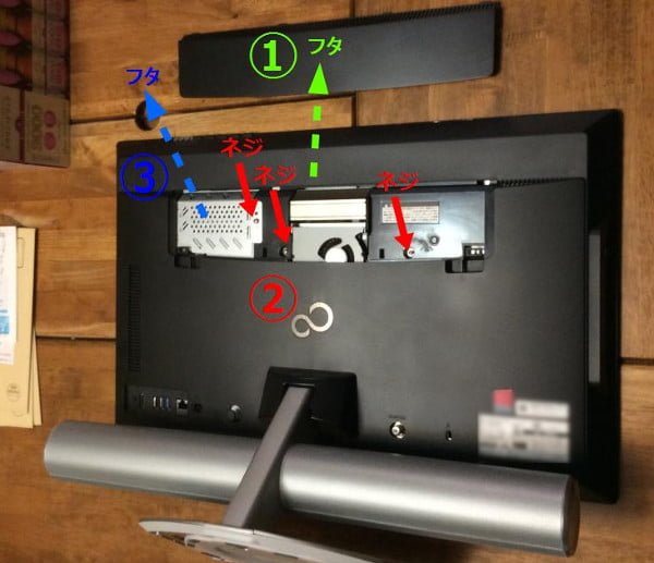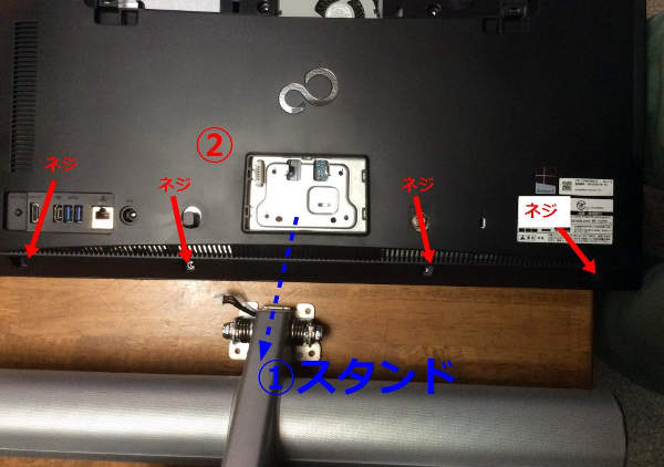 富士通 ESPRIMOデスクトップFH78/RD (型番FMVF78RDB)のHDDを交換しました。スタンドの足の部分を先に外すのがポイントです。このPCの売りである、サブウーハー内蔵スピーカーが邪魔で、ネジ穴が隠れているので難しそうですが、一度手順を見ればなんとかなる気がしてくると思います。