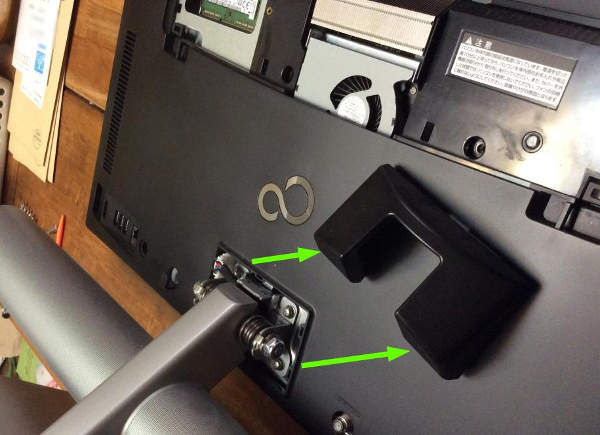 スタンドの足の付け根部分のプラスチックカバーを外します。ツメで引っかかっているだけです。わりと緩めにはまっているので、簡単に外れます。