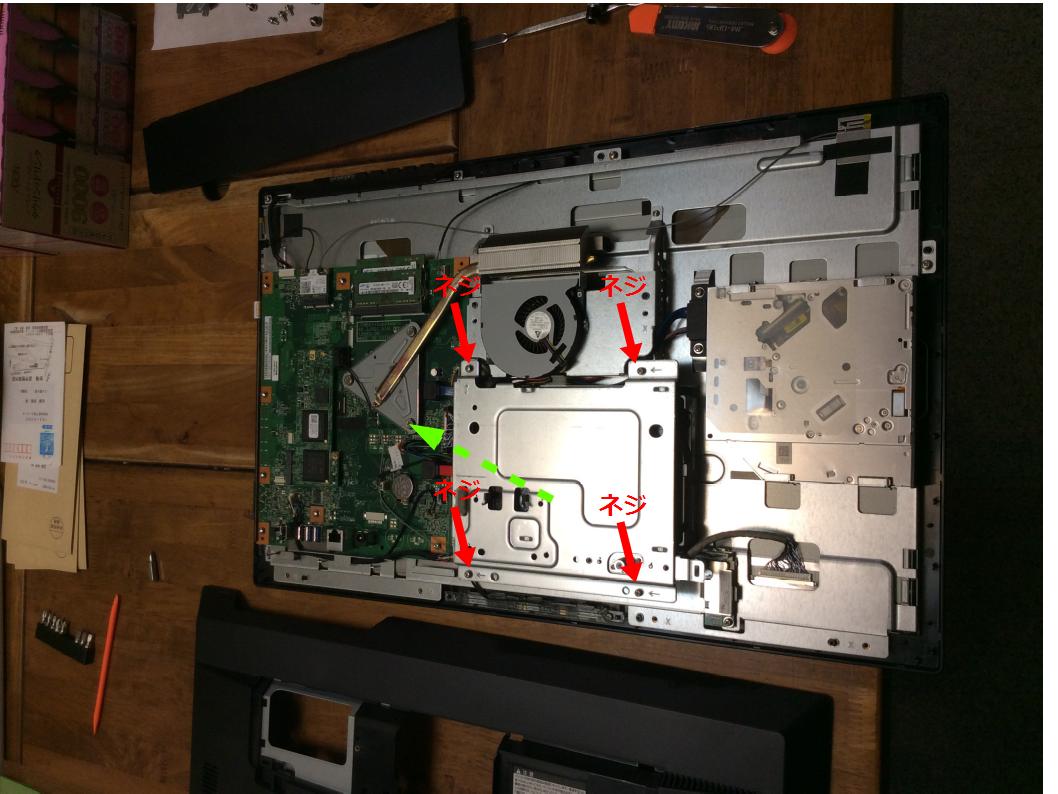 これでHDDが出てきました。あとはSATAコネクターを外すと、そのまま持ち上げることが出来ます。足として付いている4本のネジを、新しいHDDに取り付けて、この逆の手順で元に戻して、HDD換装作業が完了です。