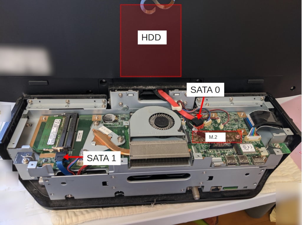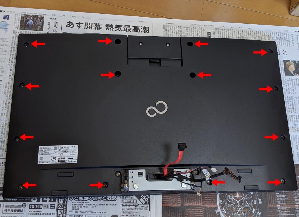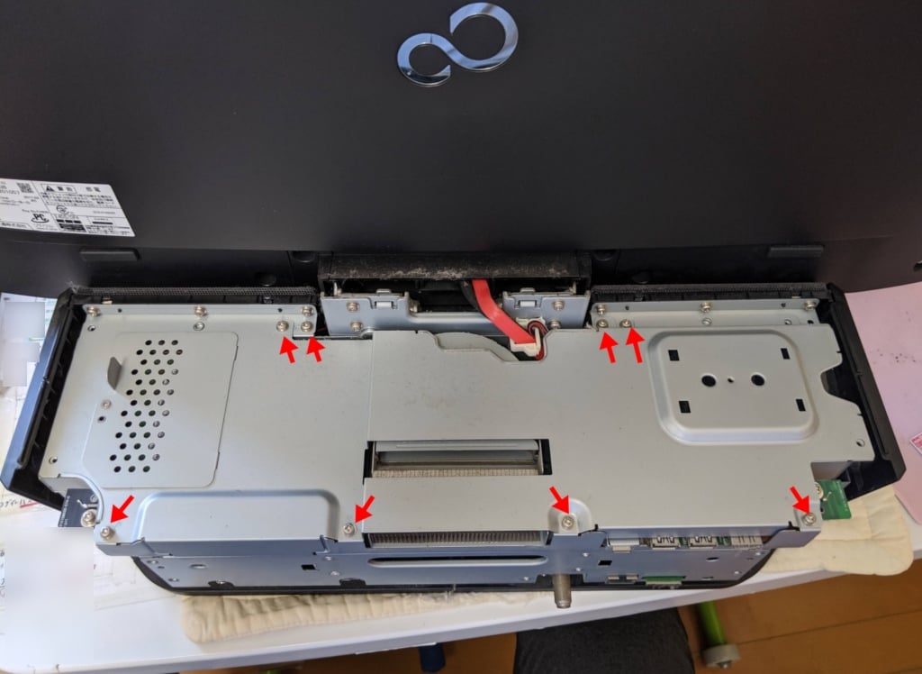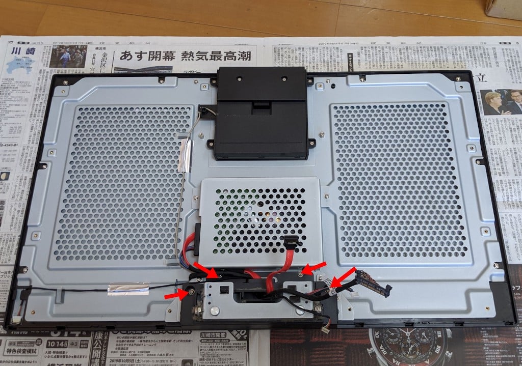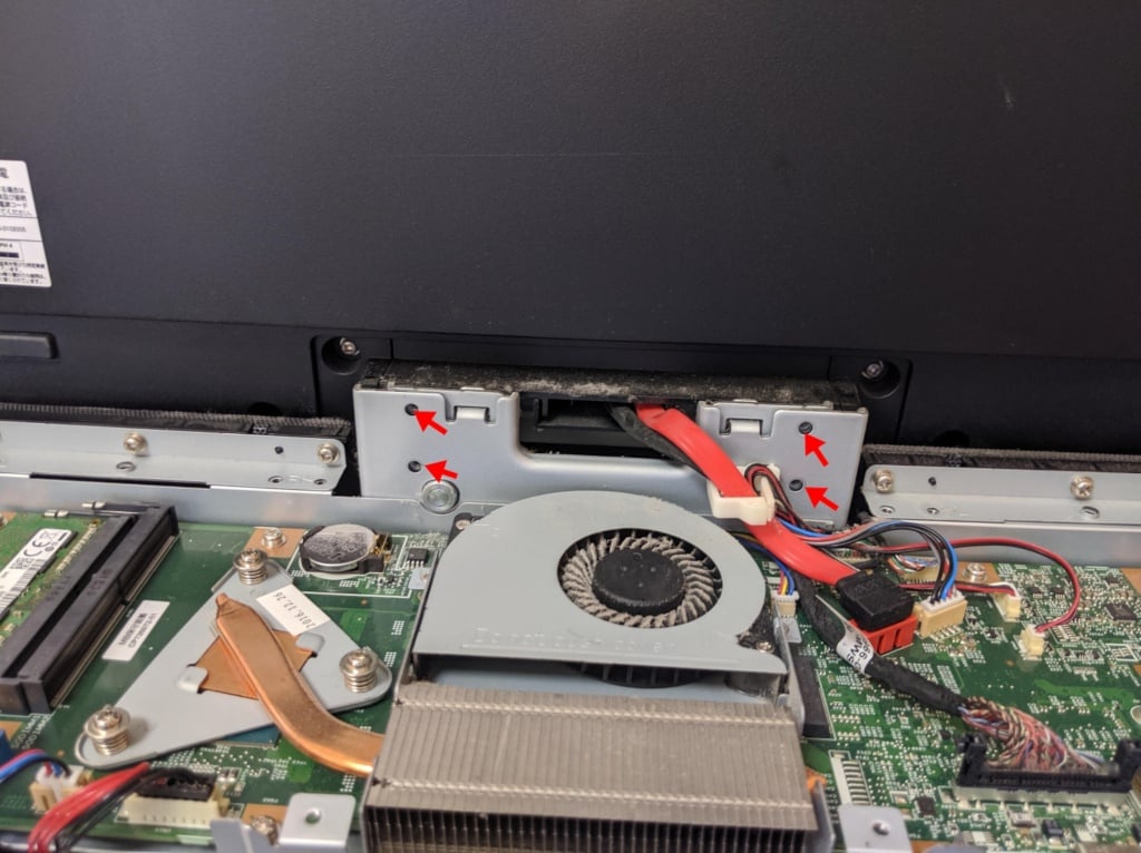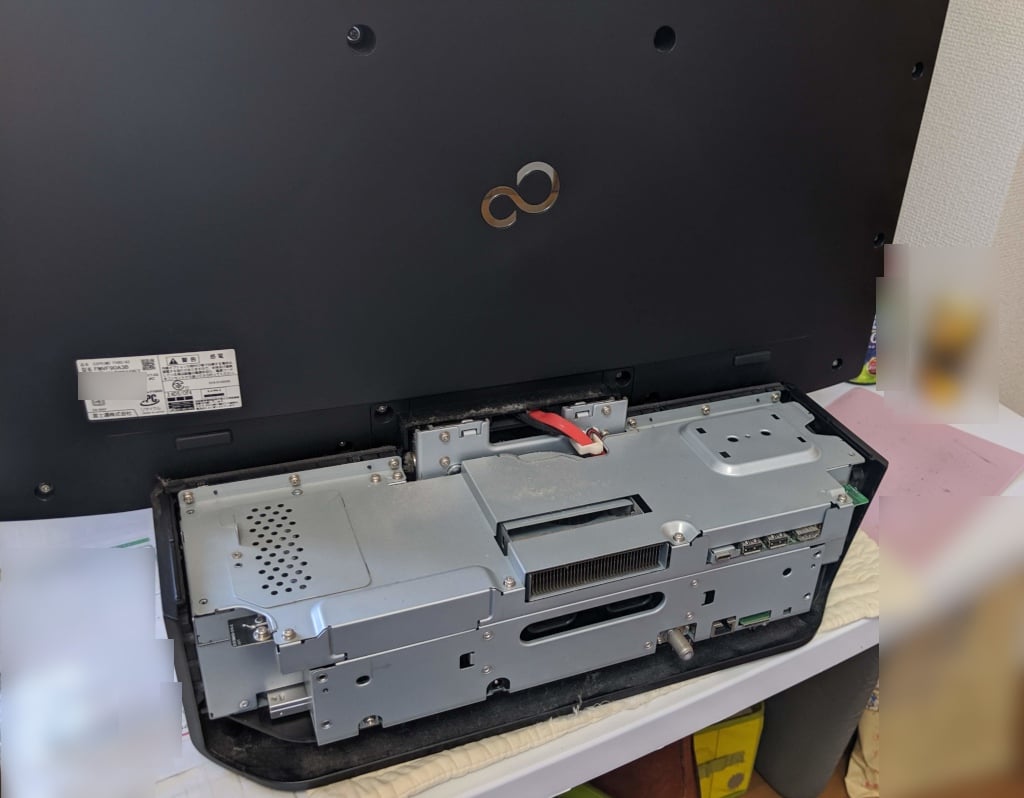 外観からスタンド部分にHDDが内蔵されているものと思っていたら、ディスプレイ部の裏に内蔵されていました。HDDを取り出す手順はかなりの工程になります。ネジを40本以上外すことになりました。もしM.2タイプのSSDを増設するならもっと簡単でした。