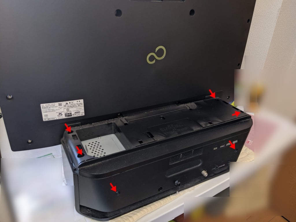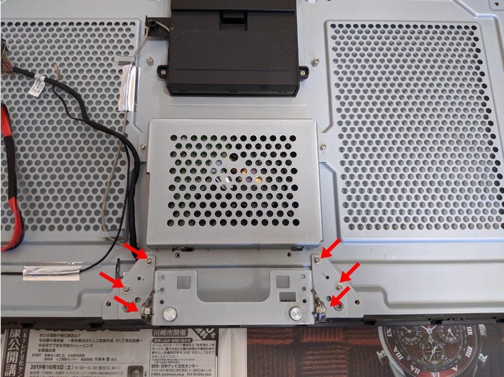 スタンド部の上部パネルをスライドして外し、ネジ6本を外します。