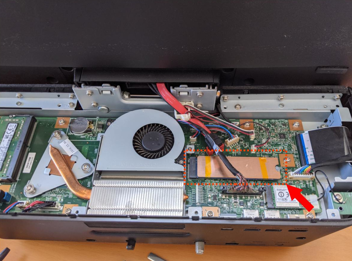 基板をよく見ると、M.2スロットが搭載されています。 当時の同じ筐体のカスタマイズモデルにはSSD+HDDモデルがあったと調べればわかったはずですが、事前調査を怠ったのを後悔しました。スペック詳細はわかりませんが、おそらくネジ穴の位置からSATAタイプでサイズ 2280のM.2 SSDが搭載可能と推測できます。