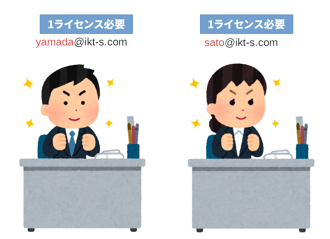 Exchange Onlineのライセンスも1ユーザーのメールアドレスひとつに割り当てられます。同じドメインのメールでもユーザーが違えば追加ライセンスが必要です。社員2人の会社でそれぞれ個別のメールアドレスを使うなら2ライセンスが必要です。新入社員を一人採用したらその人用のメールアドレスに追加ライセンスを割り当てる必要があります。