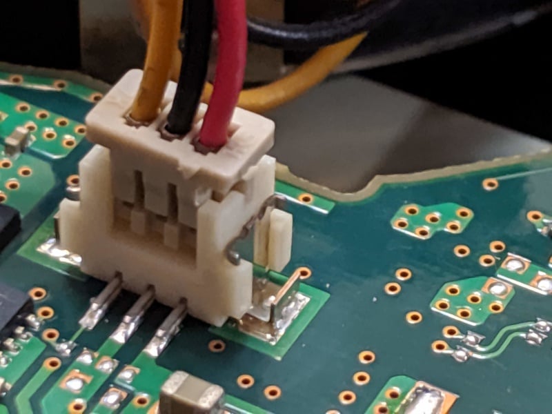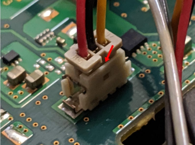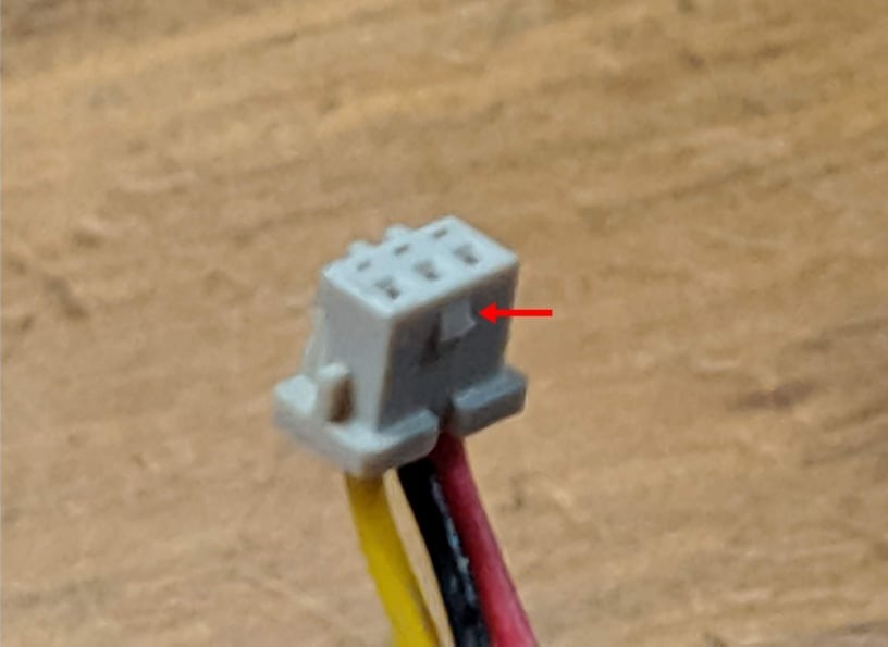 CPUファンはネジ2本を外して、コネクターを外せば取り出せます。コネクターを外すときに力まかせに引っ張ると基盤を壊しそうなくらい固いですが、下画像のポッチ(突起)部分が基盤側のコネクターに引っかかっているので、そこに小さなマイナスドライバーを突っ込んで少し浮かせながら引っ張ると外れました。