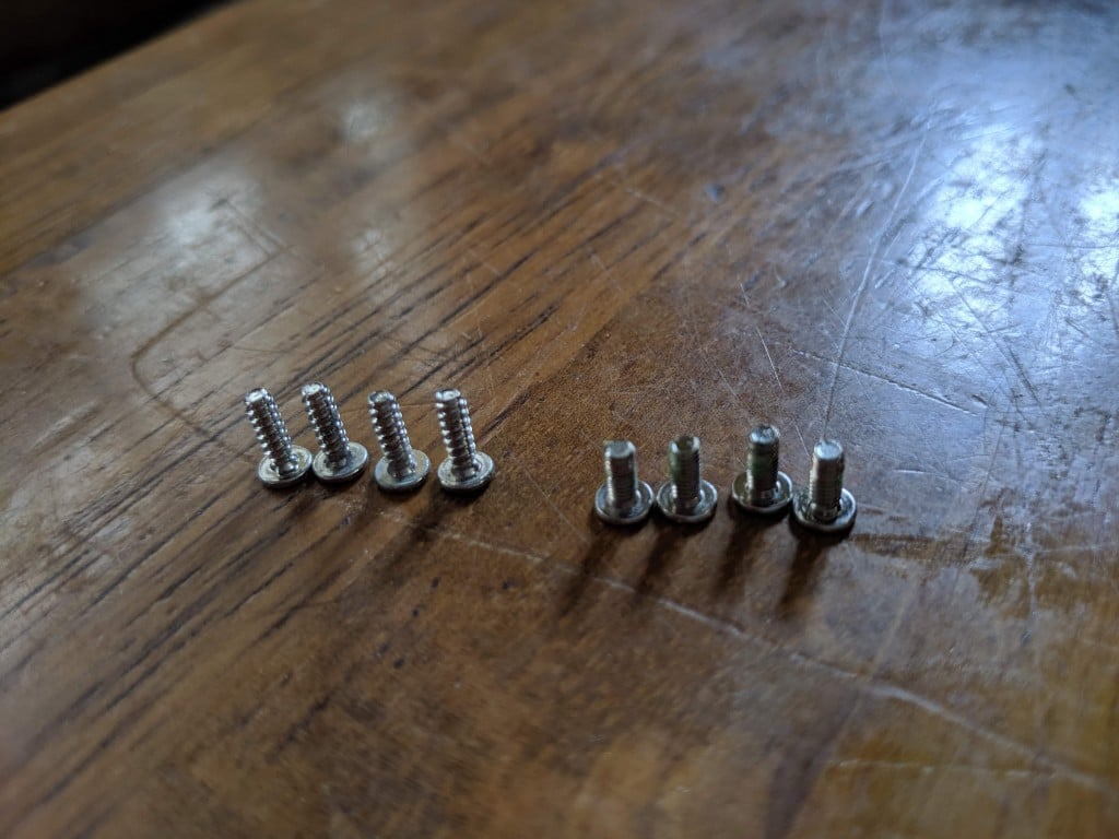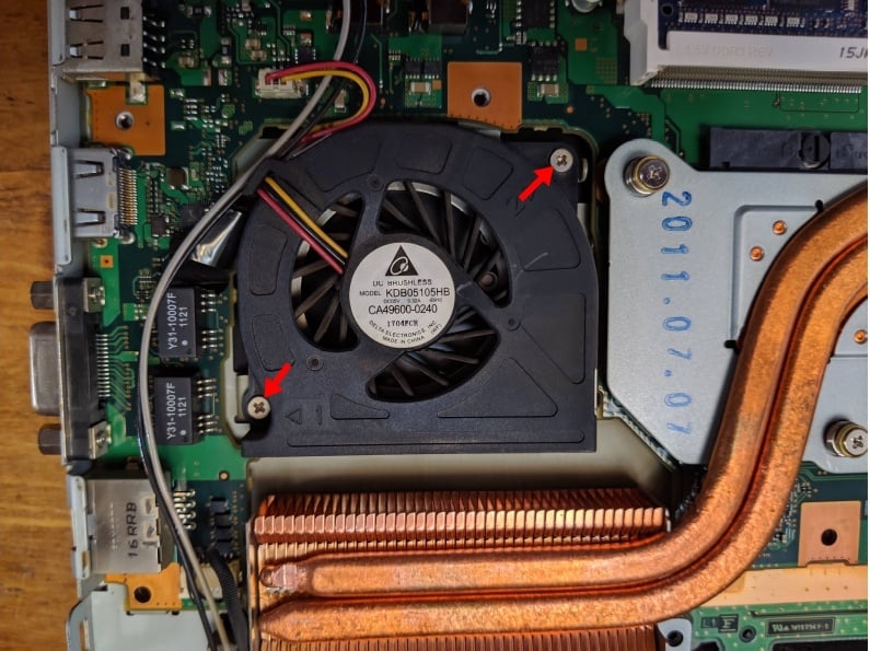 さらにCPUファンの交換をするために、裏側から見えているネジを全部外します。ネジは数を数えていませんが20本近く外しますが、その中で マークが付いている箇所のネジ7本だけはネジサイズが違います。あとで戻すときに分からなくなることがない親切なマーク付きです。