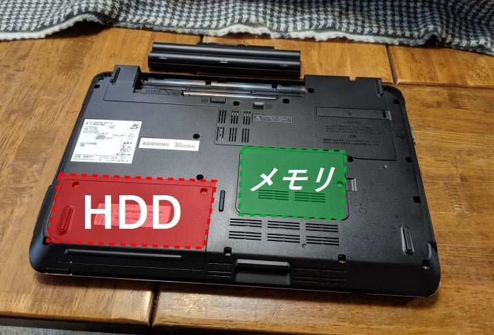 まずはバッテリーを取り外してから、HDDとメモリー交換用のフタを外します。この機種はHDDをSSDに換装するだけなら、下画像の赤く囲ったフタの2本のネジを外してHDDを取り出すことができます。