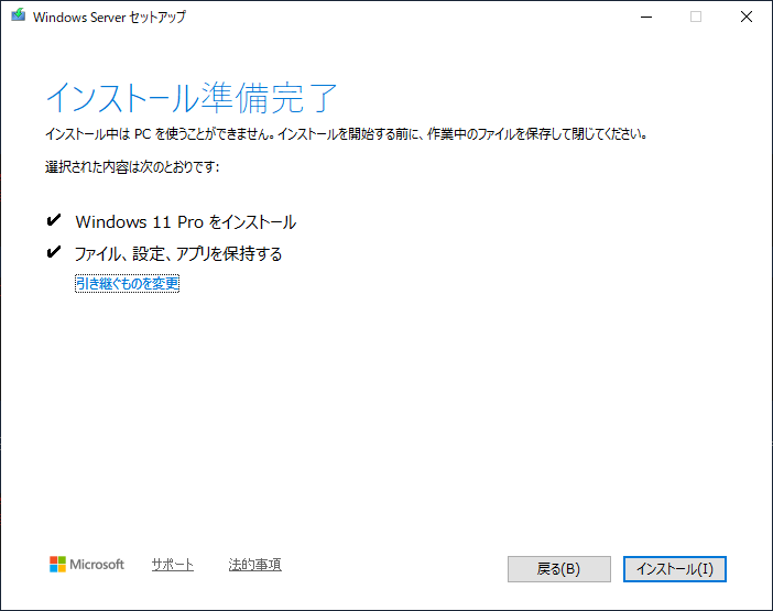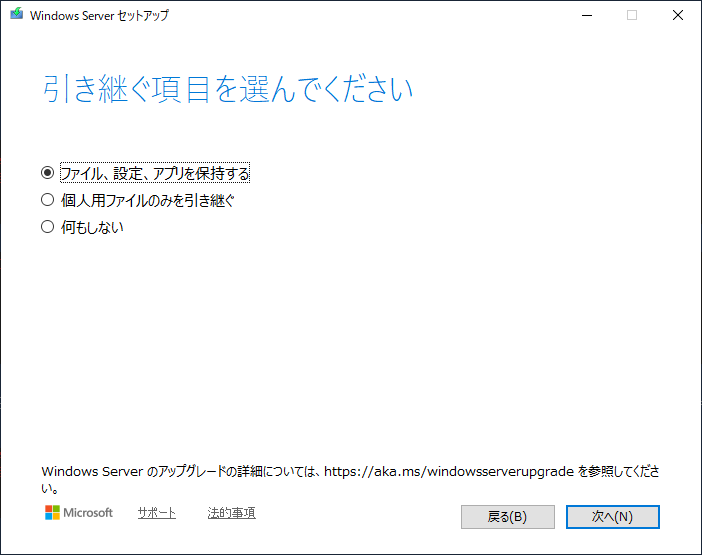 引き継ぐ項目の画面では、通常のアップグレードの場合は「ファイル、設定、アプリを保持する」にチェックを入れて「次へ」で進みます。