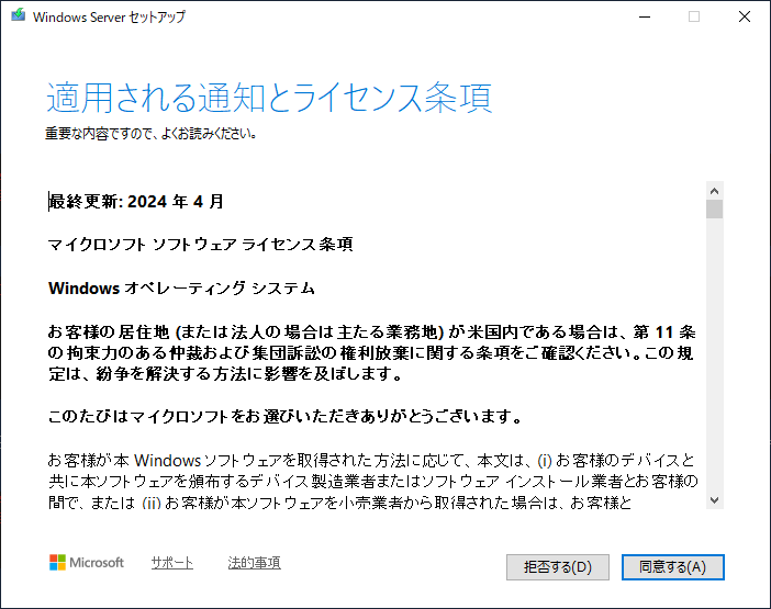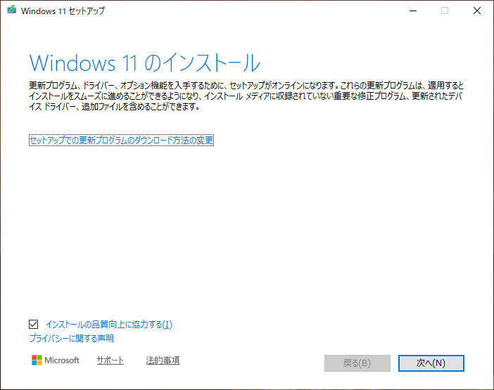 最初の画面で「次へ」で進んでもいいですが、時短をするなら「セットアップでの更新プログラムのダウンロード方法の変更」から「ダウンロードを実行しない」を選んでもいいです。どちらでも以降の手順に進めます。