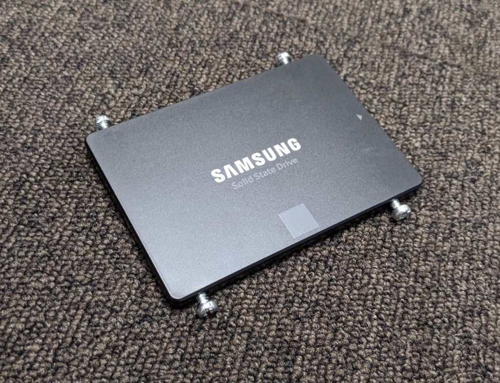 SSDに4本のネジを取り付けます。SSDのネジ穴よりサイズの大きいネジなので、先っちょしか入りませんがこれがちょうどドライブベイのレールに引っ掛かるようになるので、これでしのぎました。