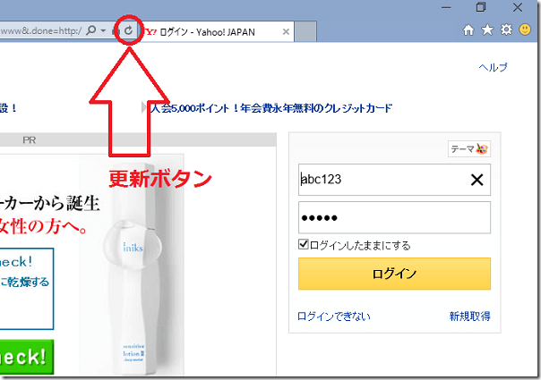そんなときに、こっそりと間違えて保存してしまったIDとパスワードだけ簡単に消す方法です。例として、Internet Explorer11でYahoo!のログイン画面にて操作した手順です。どのバージョンでもやり方は同じです。