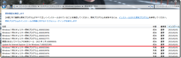 windowsの更新は適用されていました。一週間前にIE11のアップデートが適用されているのは、先週息子さんが来たときに見てもらったという話だったのでそのときwindowsアップデートをかけたと思われます。そこから考えると、それ以前のIEでも同様のエラーが出ていたと推測でき、IE11のアンインストールを試すという選択肢は消えました。