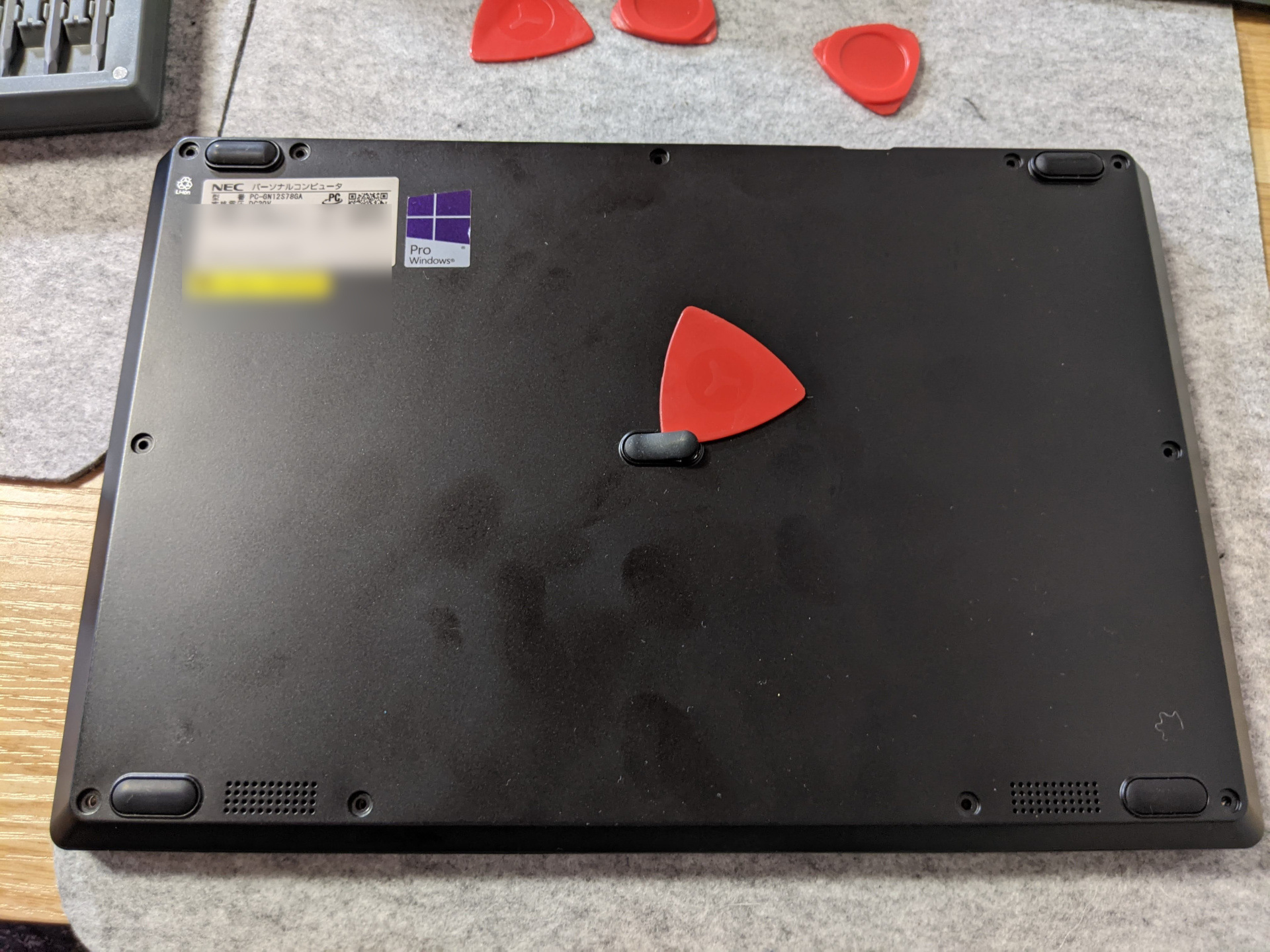 真ん中のネジだけ、ゴム足の下にある隠しネジになっています。ゴム足を剥がすと、ビニールで覆われているネジ頭の部分だけカッターで削ぎ出してネジを回して外しました。
