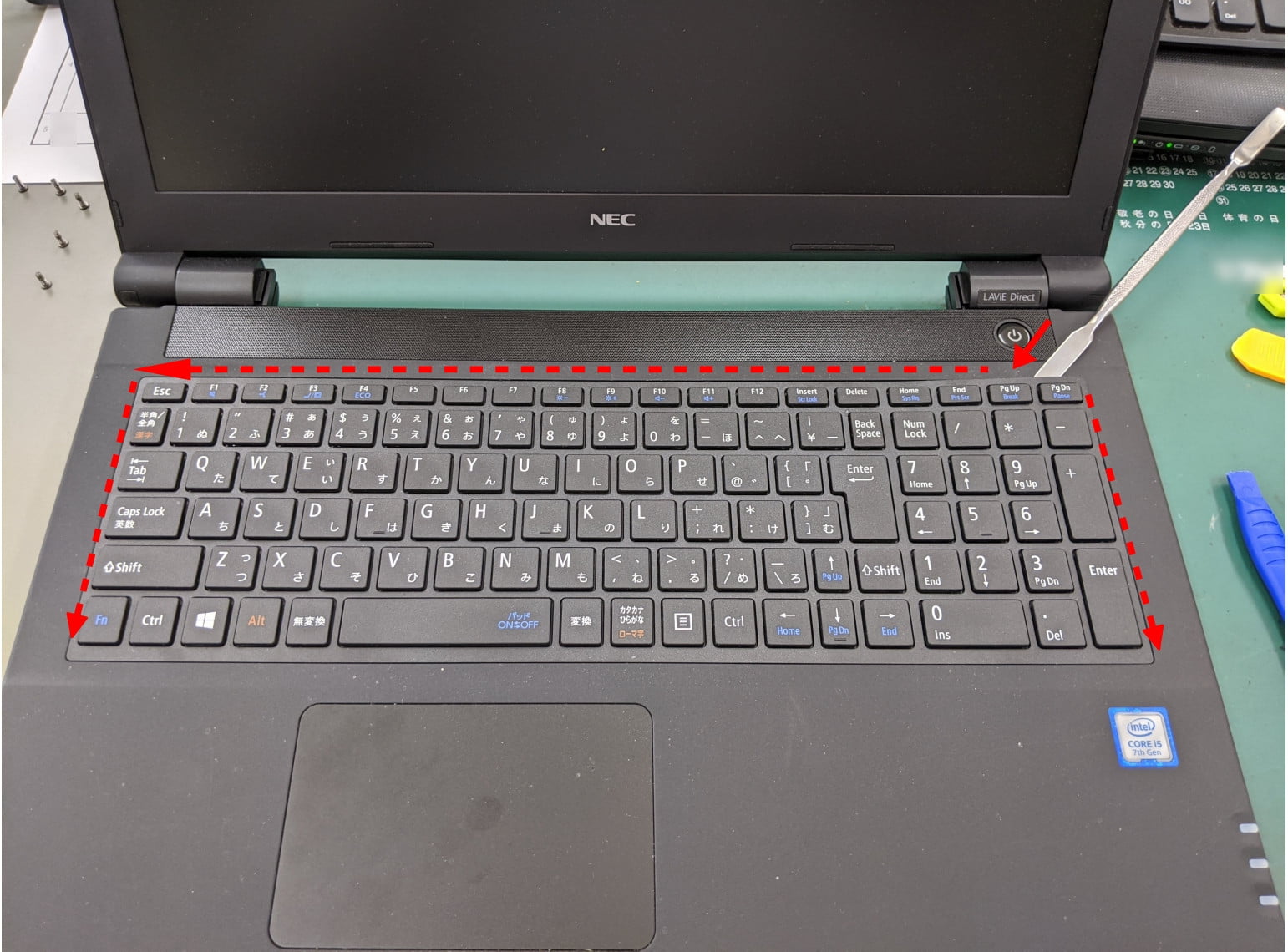 この機種はキーボード側のカバーを開けてHDDにアクセスします。分解難易度はわりと高いです。キーボードをひっぺがしたり、小さなコネクターを外すので、分解・開腹ツールを使った方が傷をつけにくく作業が捗ります。Amazonでスマートフォン用で探すと購入できます。