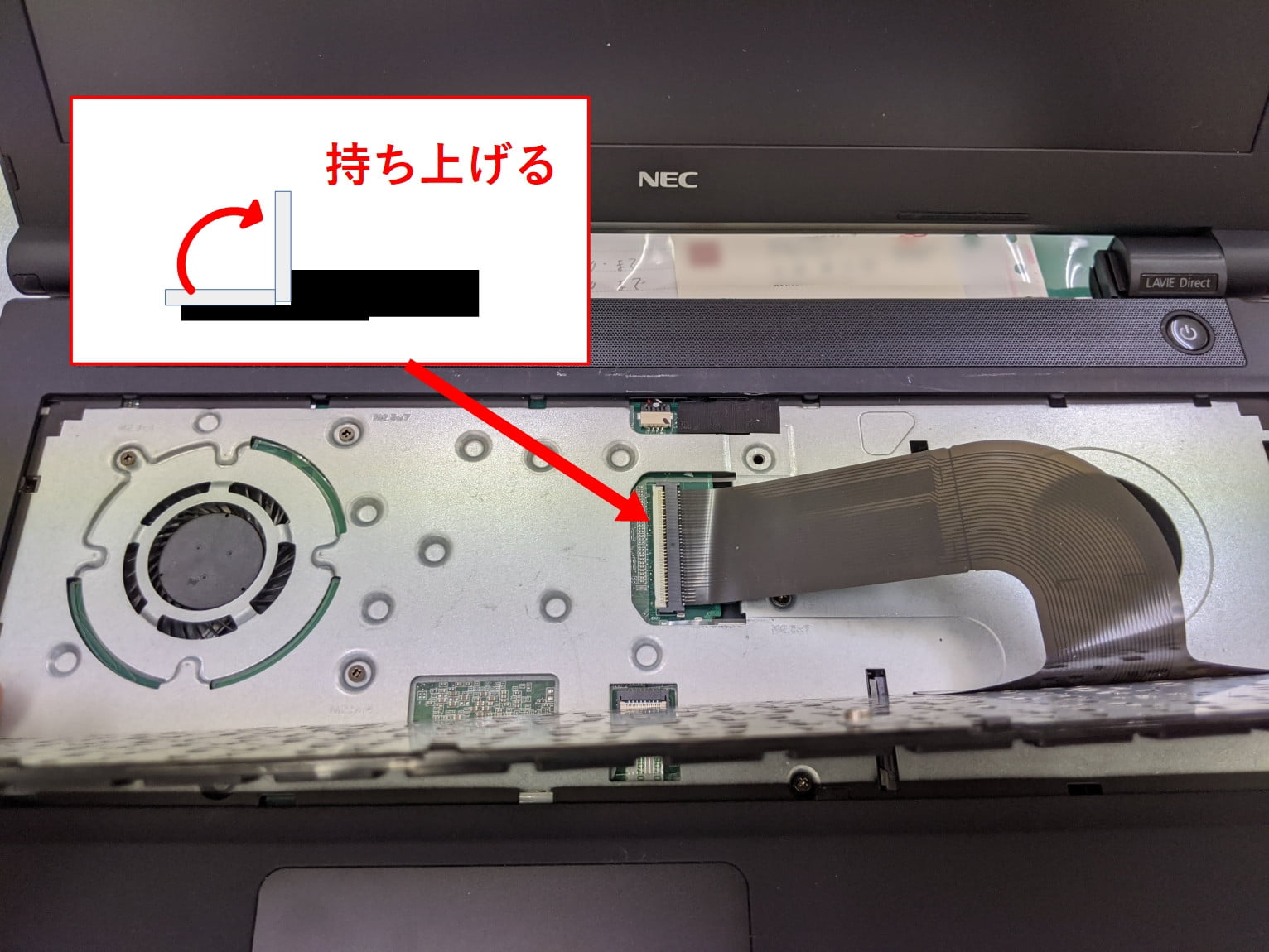 ここが今回一番の難関です。キーボード全体を手前(タッチパッド側)に押し下げると1ミリくらいずれて隙間ができるので、右上角から開腹ツールを突っ込んで上辺から裏のツメを外していきます。一つ目のツメを外すのが大変ですが、2つ目、3つ目くらい外れるとあとはパキパキと外していけます。上辺、側面が外れると斜めに持ち上げてキーボードが持ち上がります。裏にコネクターが本体とつながっているので、まだ完全に取り外せません。