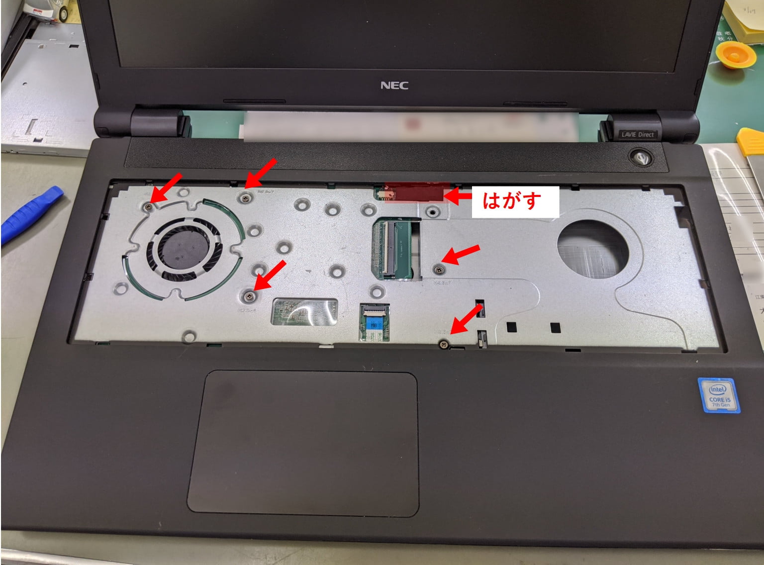 キーボードを外したことにより、見えるようになった5本のネジを外します。ネジの長さが2種類ありますが、ネジ穴のそばに「2.5M×7」「2.5M×4」と文字が刻印されているので戻すときの目安になり間違いが無いでしょう。