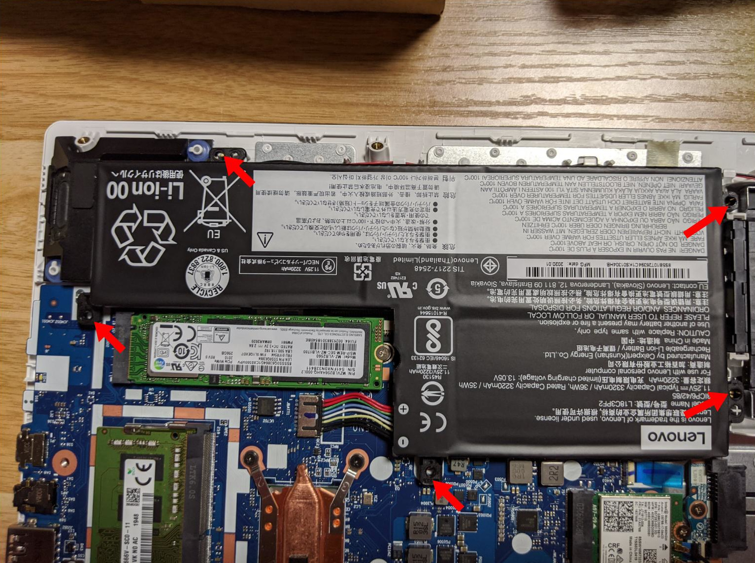 念のために先にバッテリーを外しておきます。バッテリーを止めている5本のネジを外し、バッテリー全体を取り外せば、基盤につながっているコネクターも外しやすいです。(コネクターだけ外すよりも簡単です。)バッテリーはLenovoパーツになっているのが時流を感じます。