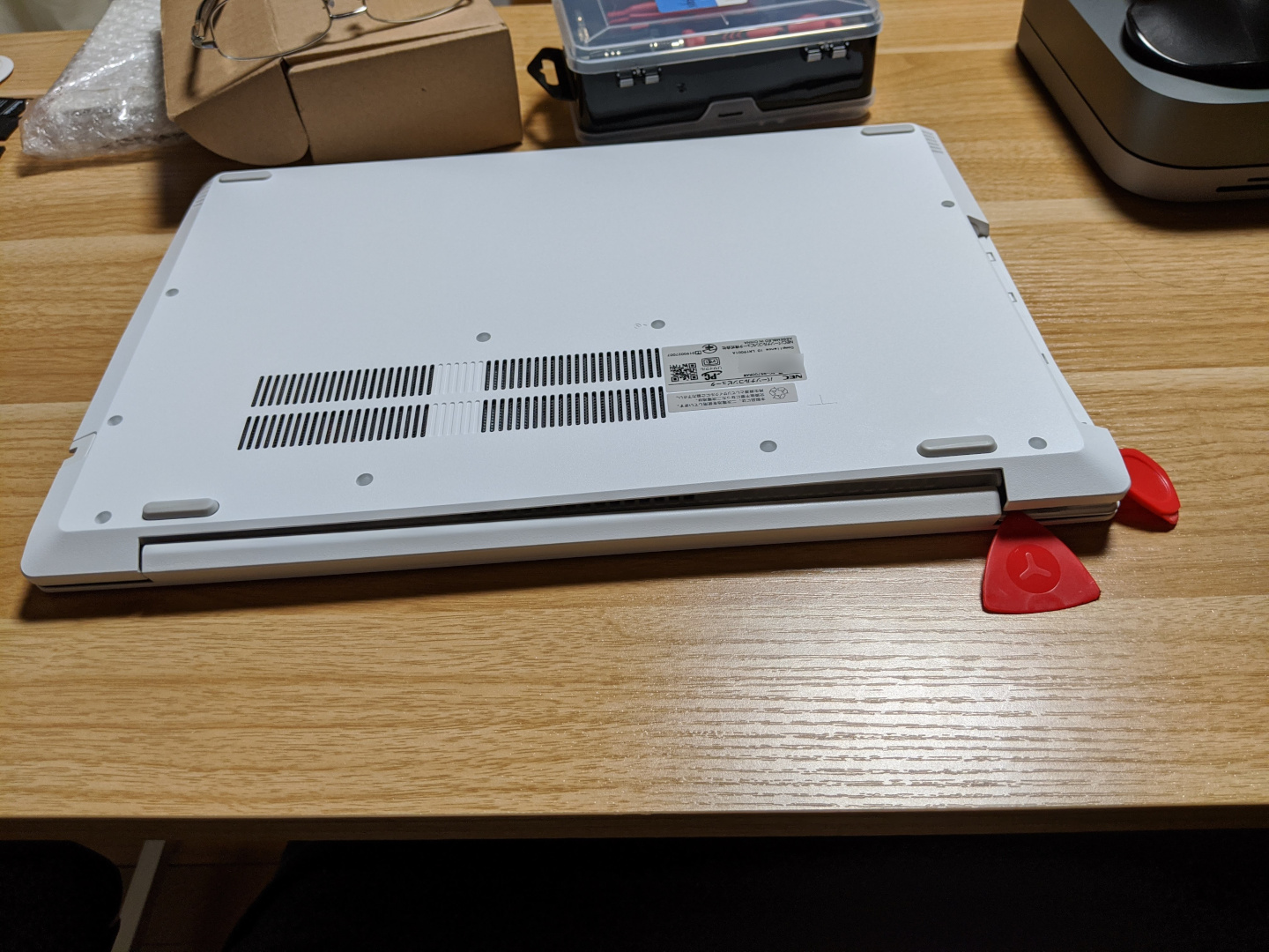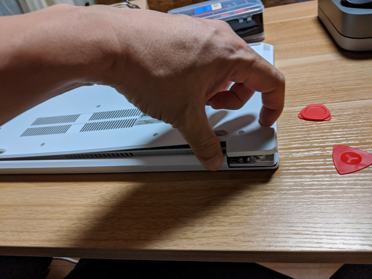 ここが一番の難関です。開腹ツールを使い裏のパネル全体をはがしていきます。液晶のヒンジ側の両端から開腹ツールを入れていき、引っ掛かっているツメを外していきます。ツメを慎重に外しながらパネルを持ち上げつつ、さらにツメを外していくとパカッと開きます。