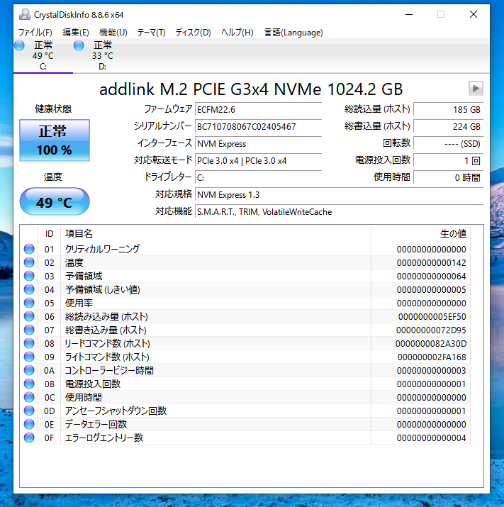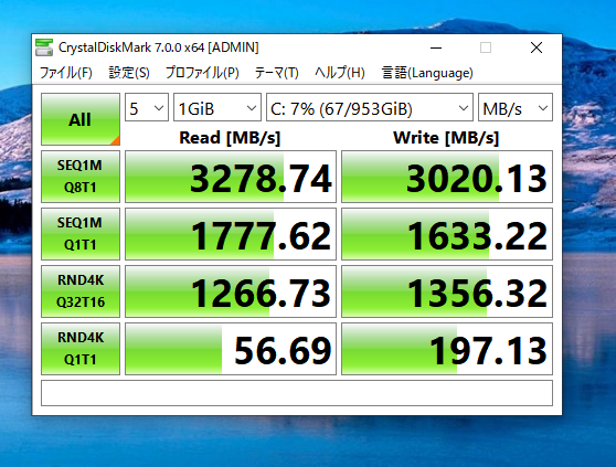 速度を測ってもスペック通りの3000MB/s以上の数値が出ているし、温度はCrystalDiskMarkを走らせている状態で49度、何もしていないアイドル時は30度台でした。