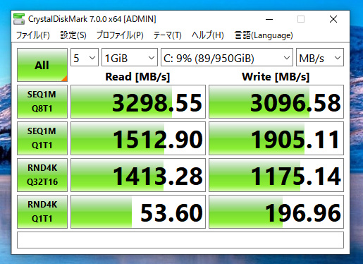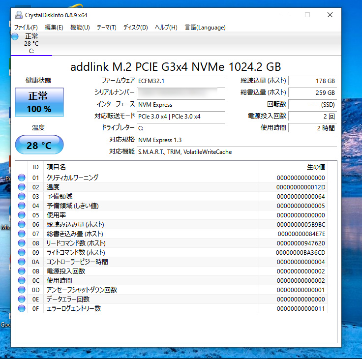 CrystalDiskMarkでリードとライトともに3000MB/s以上の速度が出ていました。CrystalDiskIndoで平常時の温度を測ると28℃でした。狙い通りの数値になりました。