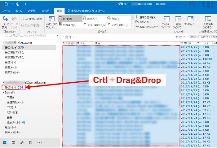 POPアカウントの受信トレイや送信済みアイテムから、移行したいメールを複数選択した状態にして、キーボードのCtrlキーを押しながらGmailアカウントの受信トレイや送信済みメールにドラッグ&ドロップしてコピーします。