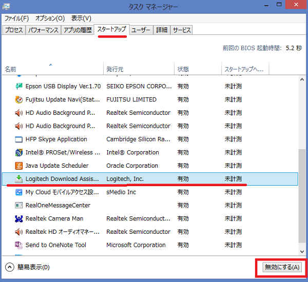 windows8.1の場合は、タスクバーを右クリックしてタスクマネージャーを開いて、「スタートアップ」タブの中のLogitech Download Assistantを選択して「無効にする」ボタンをクリックします。