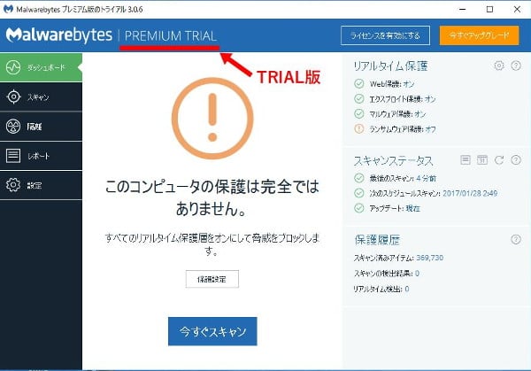 Free版とPremium版の大きな違いは、リアルタイム検索やスケジュールスキャン機能の有無です。14日間Premium版のトライアルを試して、気に入ればライセンスを購入しても良いと思います。別な統合セキュリティソフトを利用していて、セカンドオピニオン的に手動でスキャンしたいという利用目的の場合は、FREE版に変更しておくのが良いと思います。
