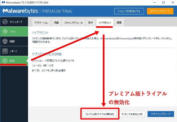 設定のマイアカウントタブを開くと、プレミアム版トライアルの無効化というボタンがあるのでクリックします。それにより、利用期限が無期限のFREE版に変更できます。