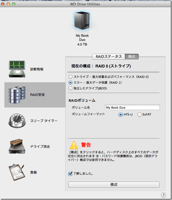 今回はデータ保護優先のため、ミラー(RAID1)、Mac専用なのでフォーマット形式をHFS+Jにしました。「構成」ボタンを押したら数秒でフォーマットが完了します。