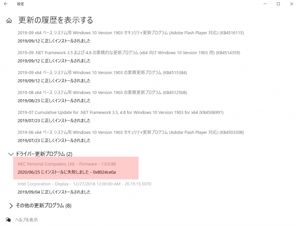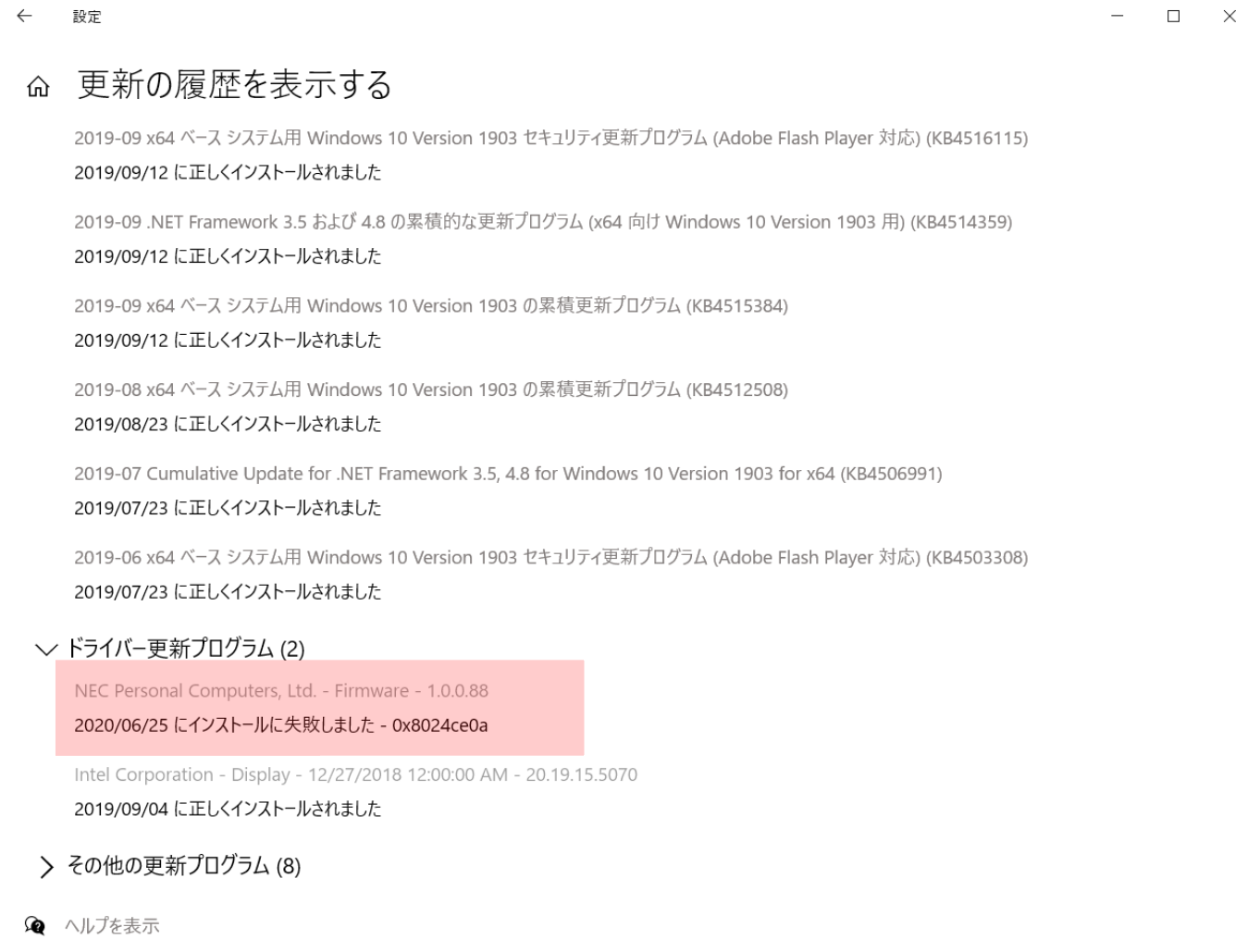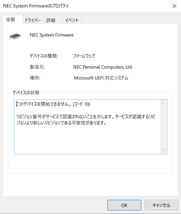 ただし、NEC System Firmwareは更新履歴ではインストール失敗のままですし、デバイスマネージャー上では「このデバイスを開始できません(コード10)」のままです。