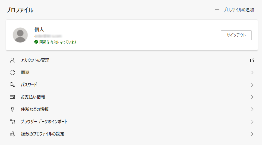 Edgeブラウザーを開いて右上「…」⇒設定⇒プロファイル を開きます。