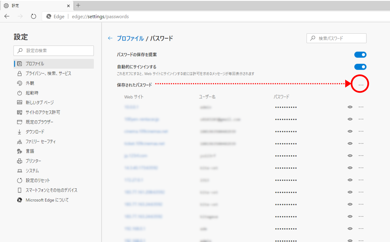 Edgeブラウザーを開いて右上「…」⇒設定⇒プロファイル⇒パスワード を開きます。