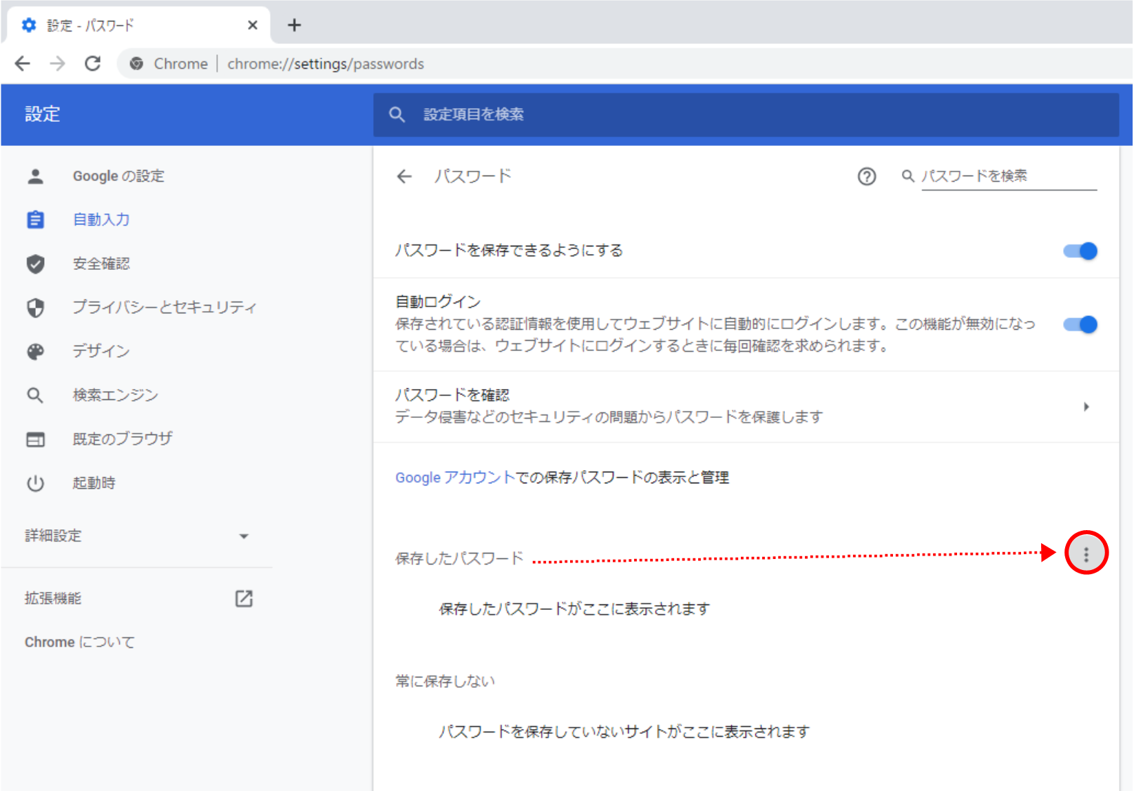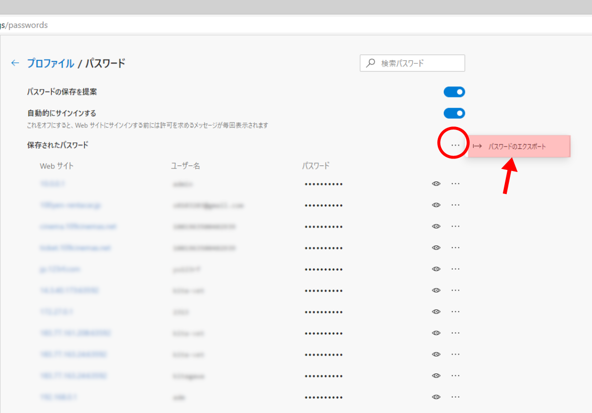 ちょっと場所が分かりにくいですが、保存されたパスワードの文字の右横にある「…」をクリックします。その下に並んでいる各パスワードの「…」ではありません。