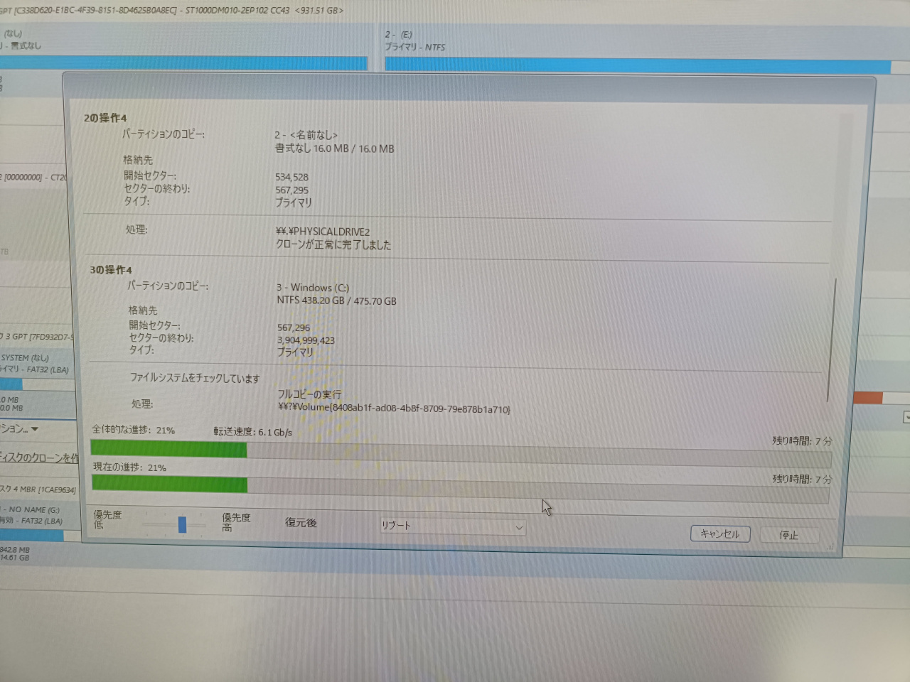 クローンをスタートさせて完了するまで10分以内で成功しました。転送速度6.1Gb/s~6.5Gb/sが出ていました。狙い通りです。