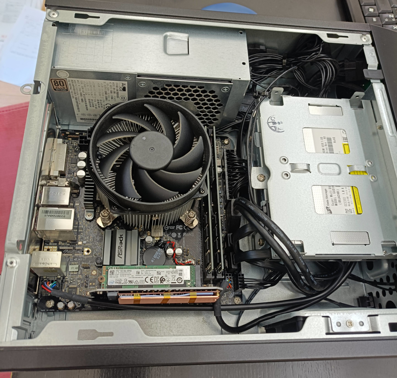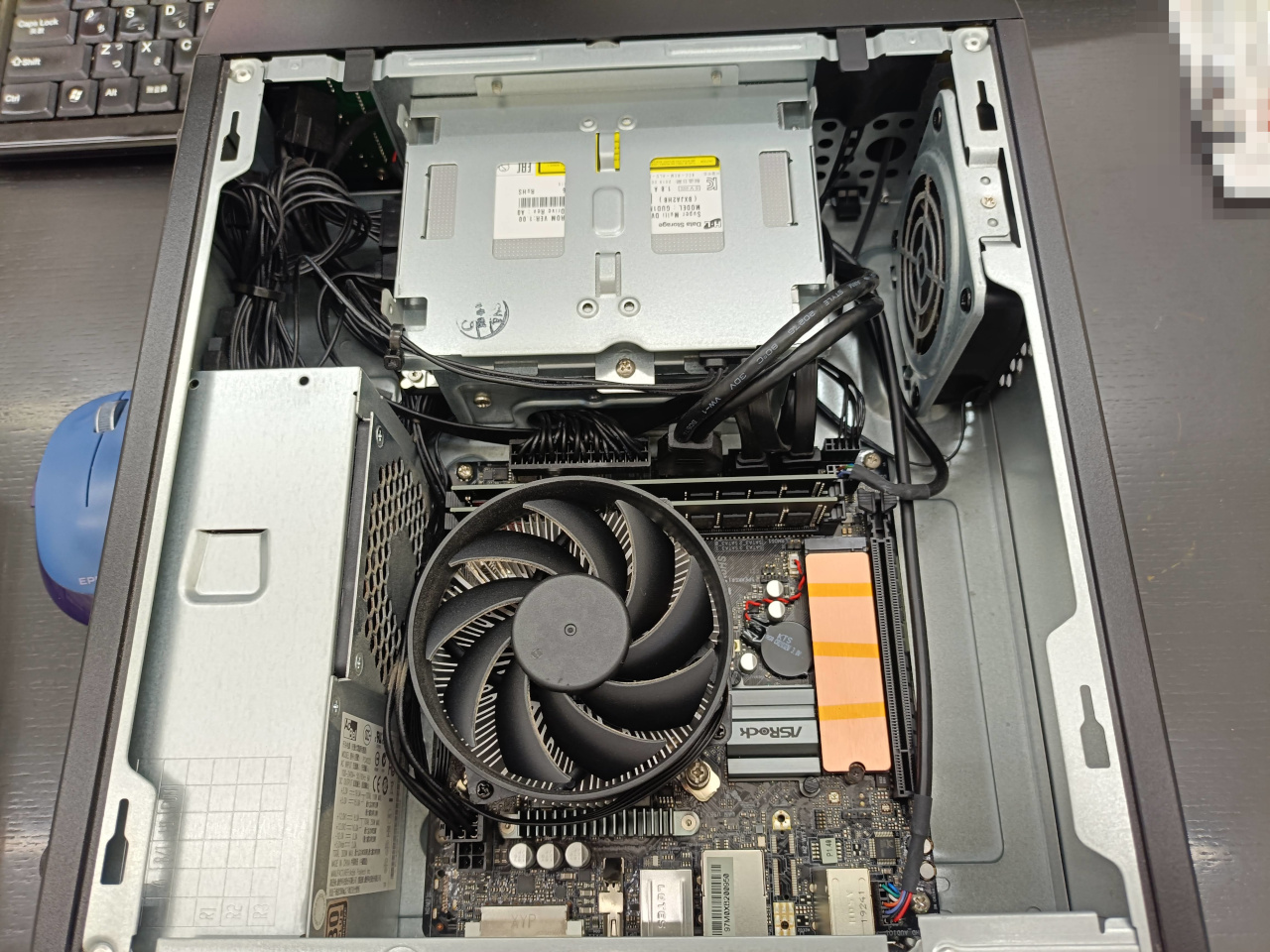 デスクトップ本体に装着しました。予定通りPCIe x16の空きスロットがあったのでそこに挿し込めました。下画像のマザーボードに対して立て掛けて挿しているのがターゲット側、マザーボードの面に見えるのがマスター側のSSDです。