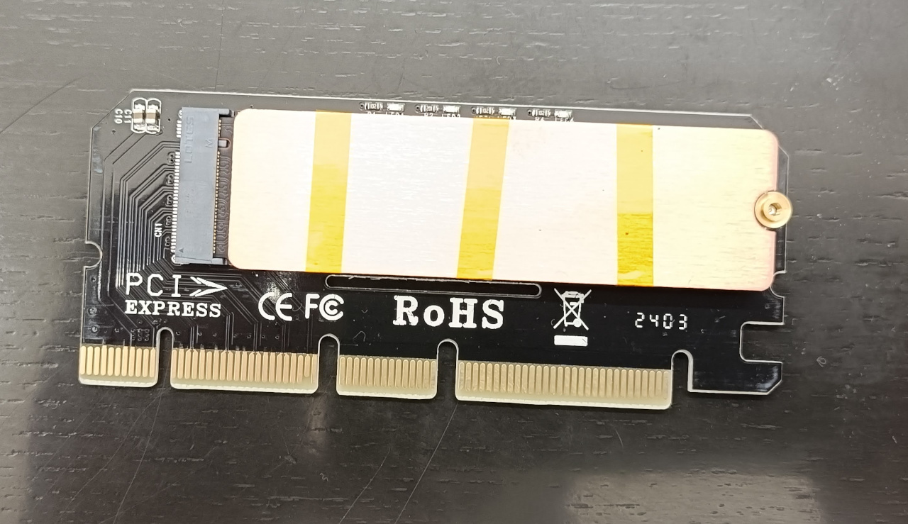 M.2 NVMe to PCIe x16 x8 x4 変換アダプタ/拡張カードはAmazonでこちらを用意しました。PCIe ×16に対応しているところが肝の部分です。PC側にもPCIeのフルサイズのスロットが空いている必要があります。フルサイズの半分サイズが×8、四分の一サイズが×8、一番小さいサイズが×2なので、PC側の搭載されているスロットサイズに要注意です。転送速度もそれに比例しているのでPCIe ×4以下だとUSB外付けとあまり変わらなくなります。