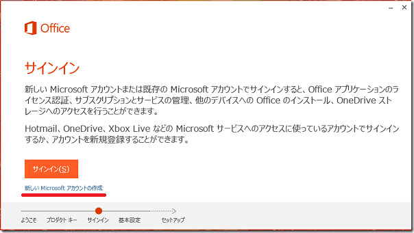 「新しいMicrosoftアカウントの作成」をクリックしてMSアカウントを作ってサインインします。