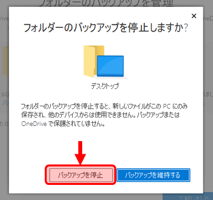 次に確認画面が出てくるので、「バックアップを停止」ボタンの方をクリックします。逆を押すと再度バックアップ同期を復活させる方に進んでしまいます。