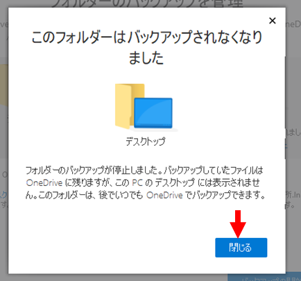 これで、デスクトップ・ドキュメント・ピクチャのバックアップ同期は停止できました。少し待つとOneDriveで同期していたファイルやフォルダーが消えたように見えますが、慌てず次の作業で戻せます。