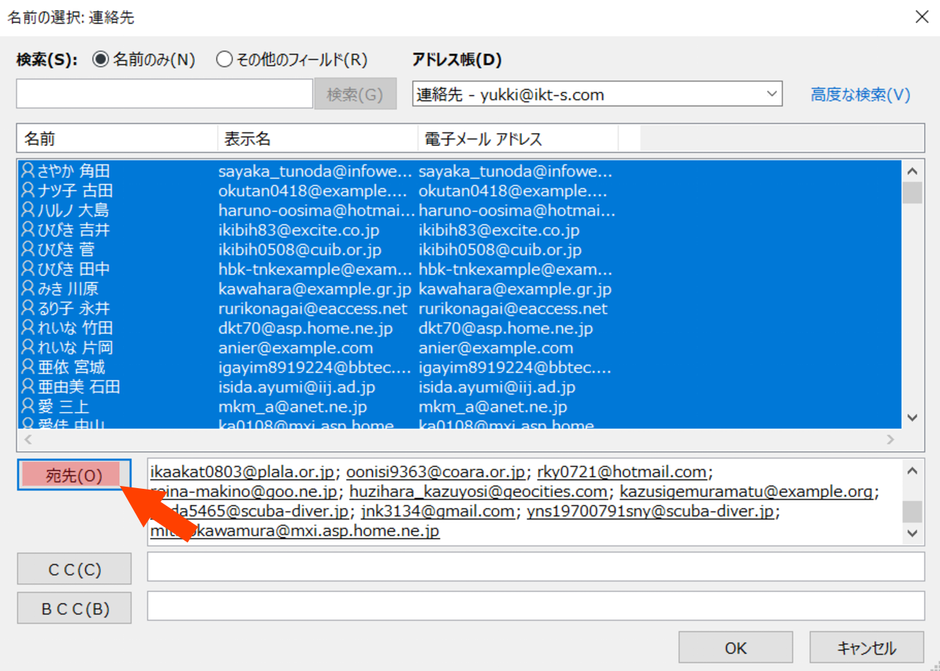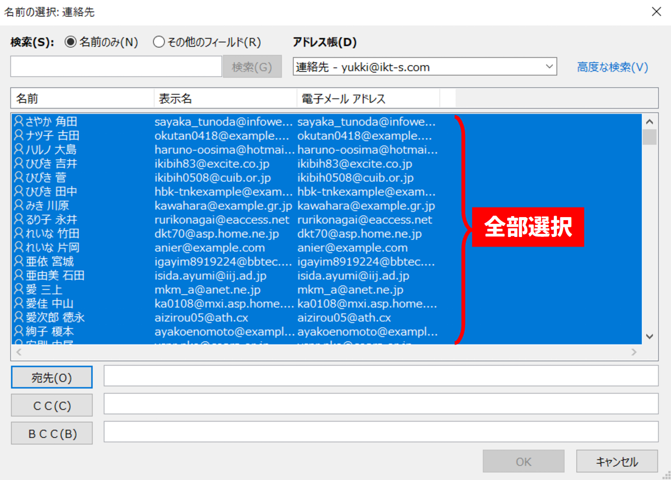 「宛先」ボタンを押してアドレス全件を宛先に追加して「OK」ボタンを押して閉じます。
