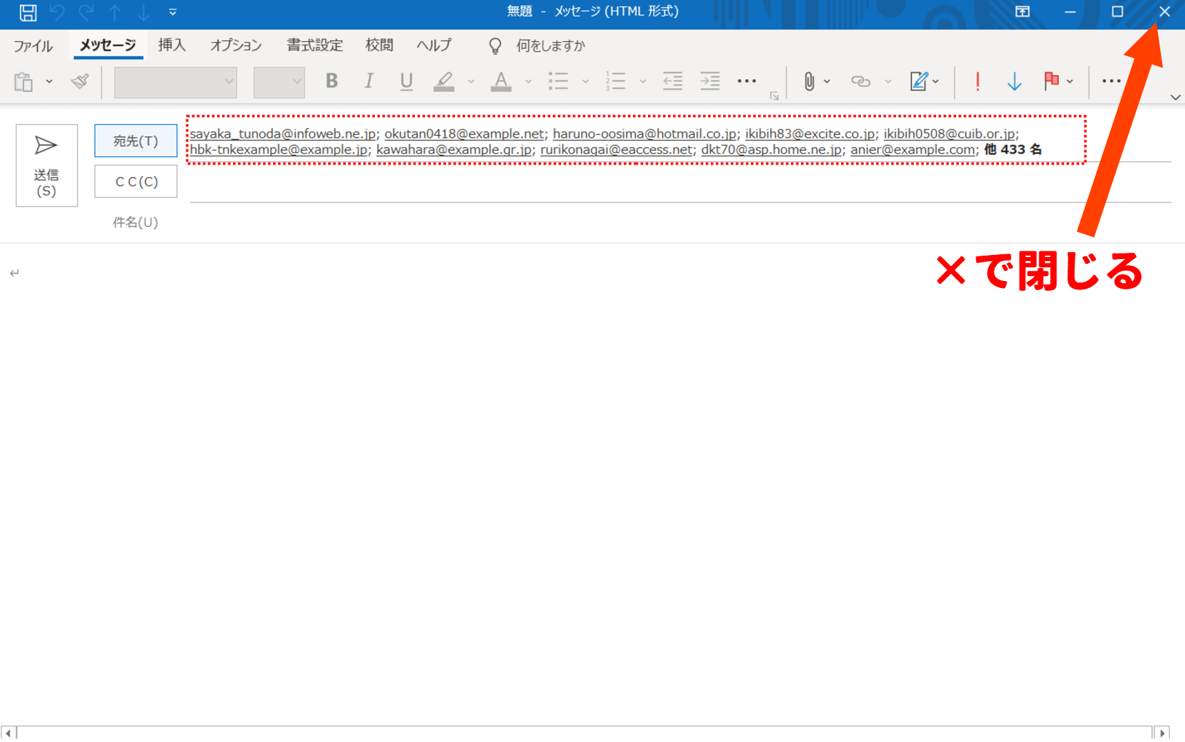 宛先にメールアドレスが全件入っている状態を確認したら、右上×(バツ)でメール作成画面を閉じます。
